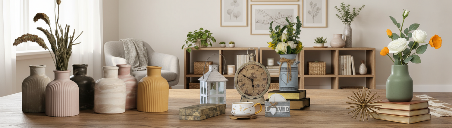 A collection of décor pieces perfect for gifts, such as figurines, vases, or wall décor—ideal for birthdays, housewarmings, or holidays.