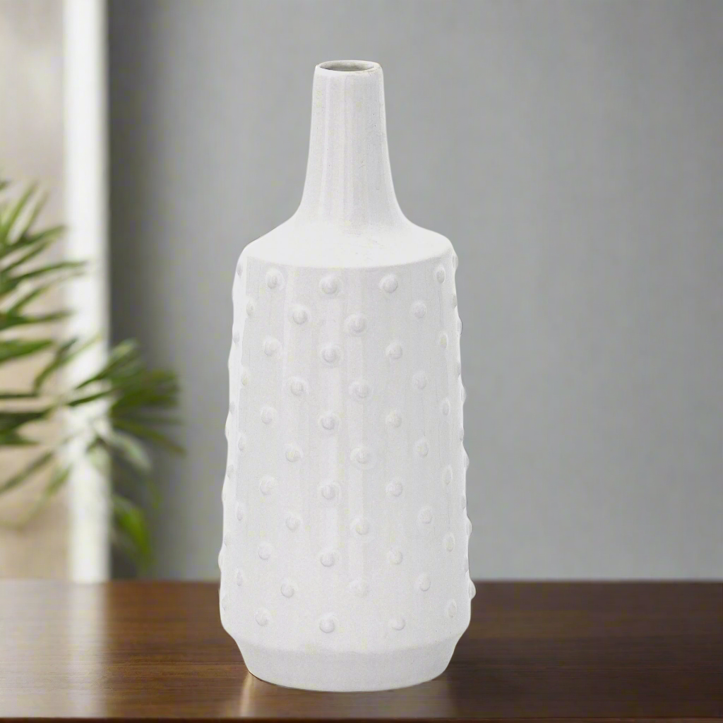 The Raven Embossed Dotted Ceramic Vase features a rounded body with a narrow mouth and a raised dotted design that adds depth and tactile detail. Set on a tapered base and finished in a smooth, high-gloss glaze, this vase offers a sculptural presence that works beautifully as a standalone accent or as part of a styled arrangement. Available in two sizes for visual balance and layering.
