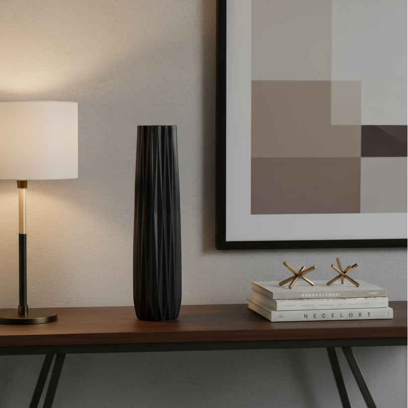 Sleek and sculptural, the Kitte Ceramic Elongated Round Vase brings a touch of modern refinement to any interior. Its tall, rounded silhouette paired with a subtle ribbed texture creates an elegant visual rhythm, while the matte black finish adds depth and sophistication.