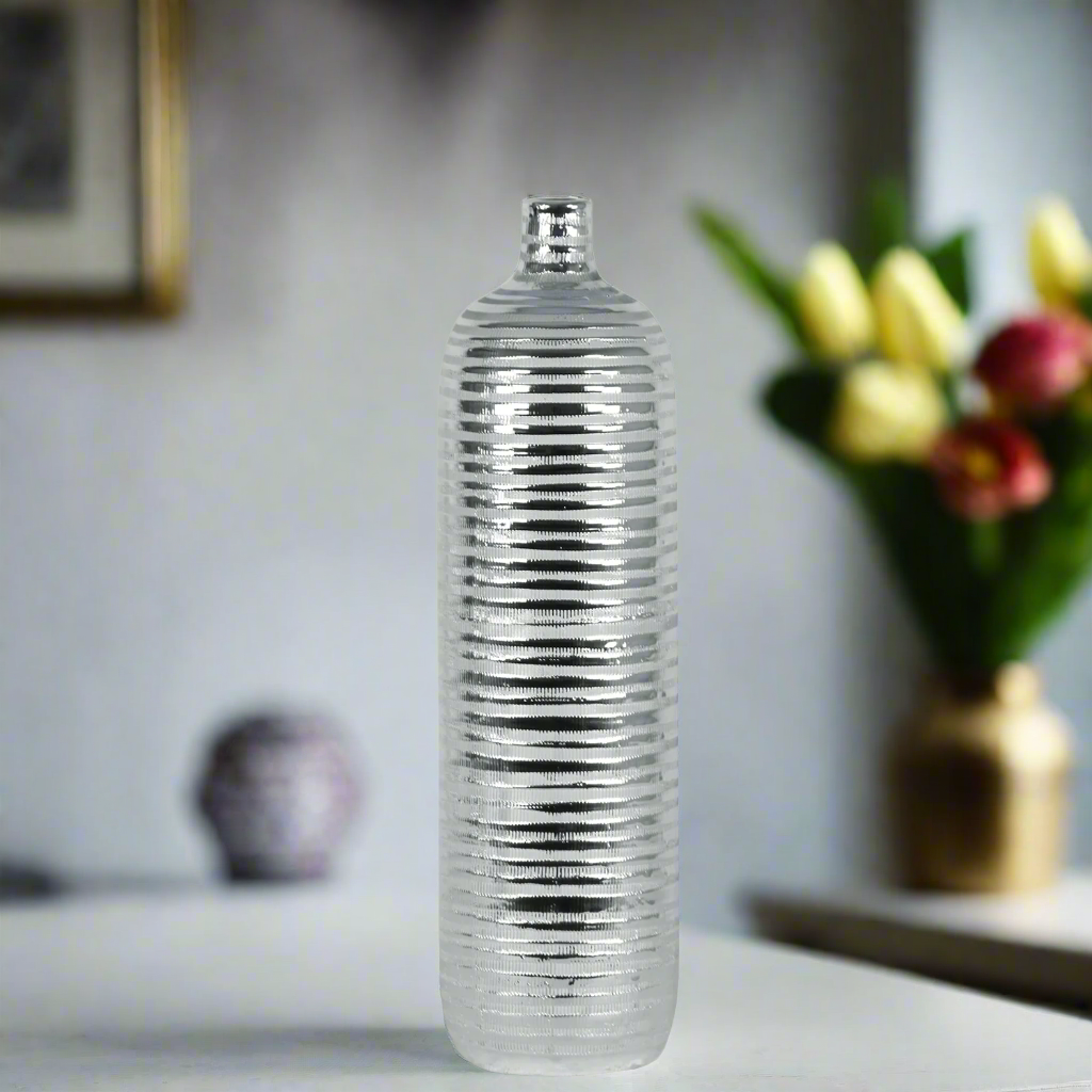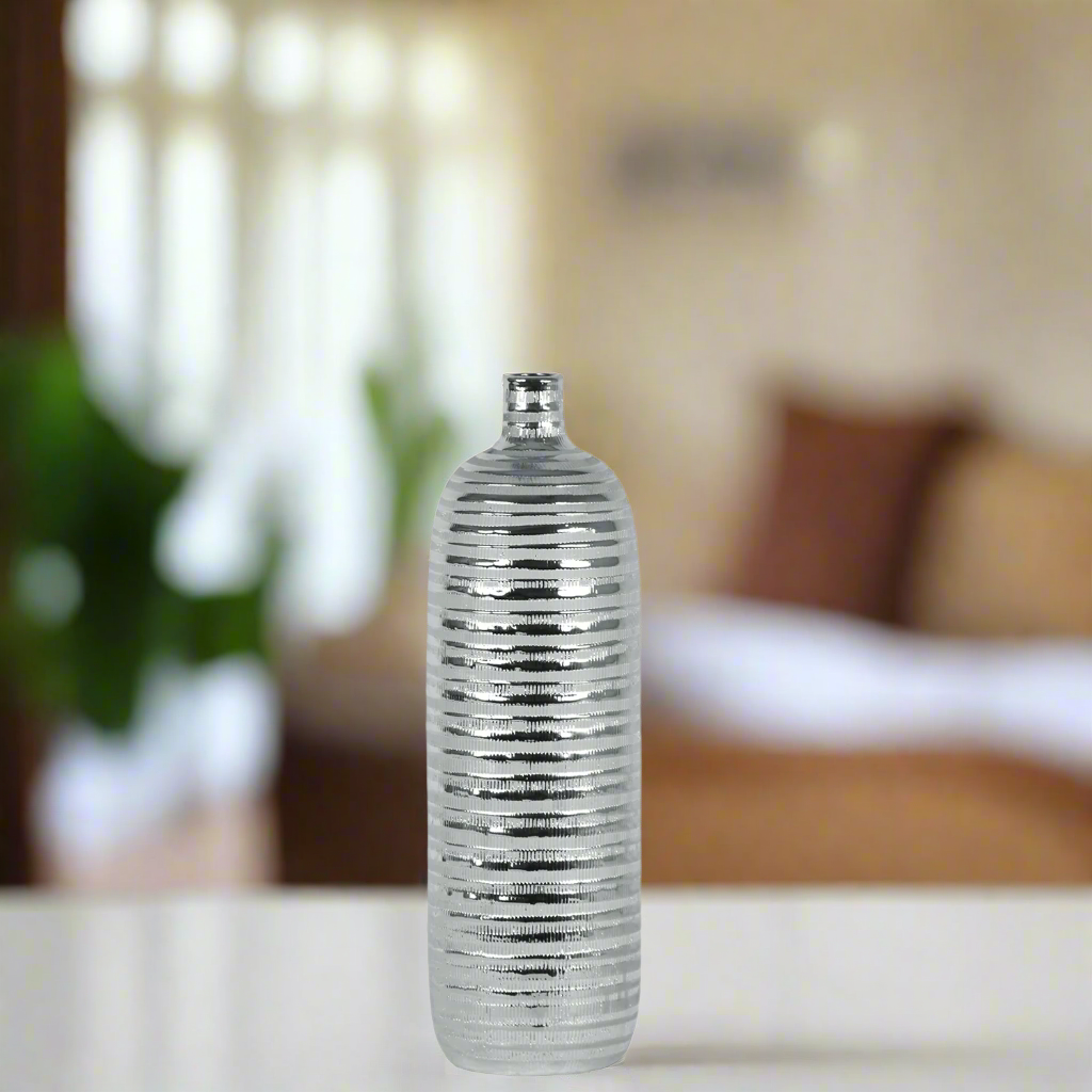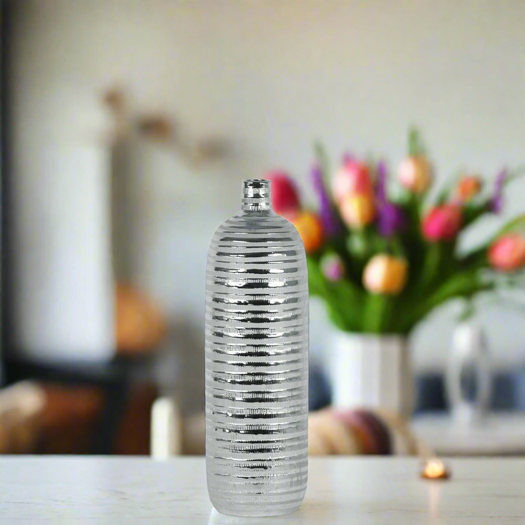 The Blossom Ceramic Vase highlights a tall, refined form with a narrow and short neck, finished with delicate rims for a graceful profile. Its combed design body introduces subtle texture and artistry, while the coated metallic finish adds a touch of modern sophistication. Perfect as a statement décor piece or styled with floral arrangements, Blossom seamlessly blends elegance and versatility.