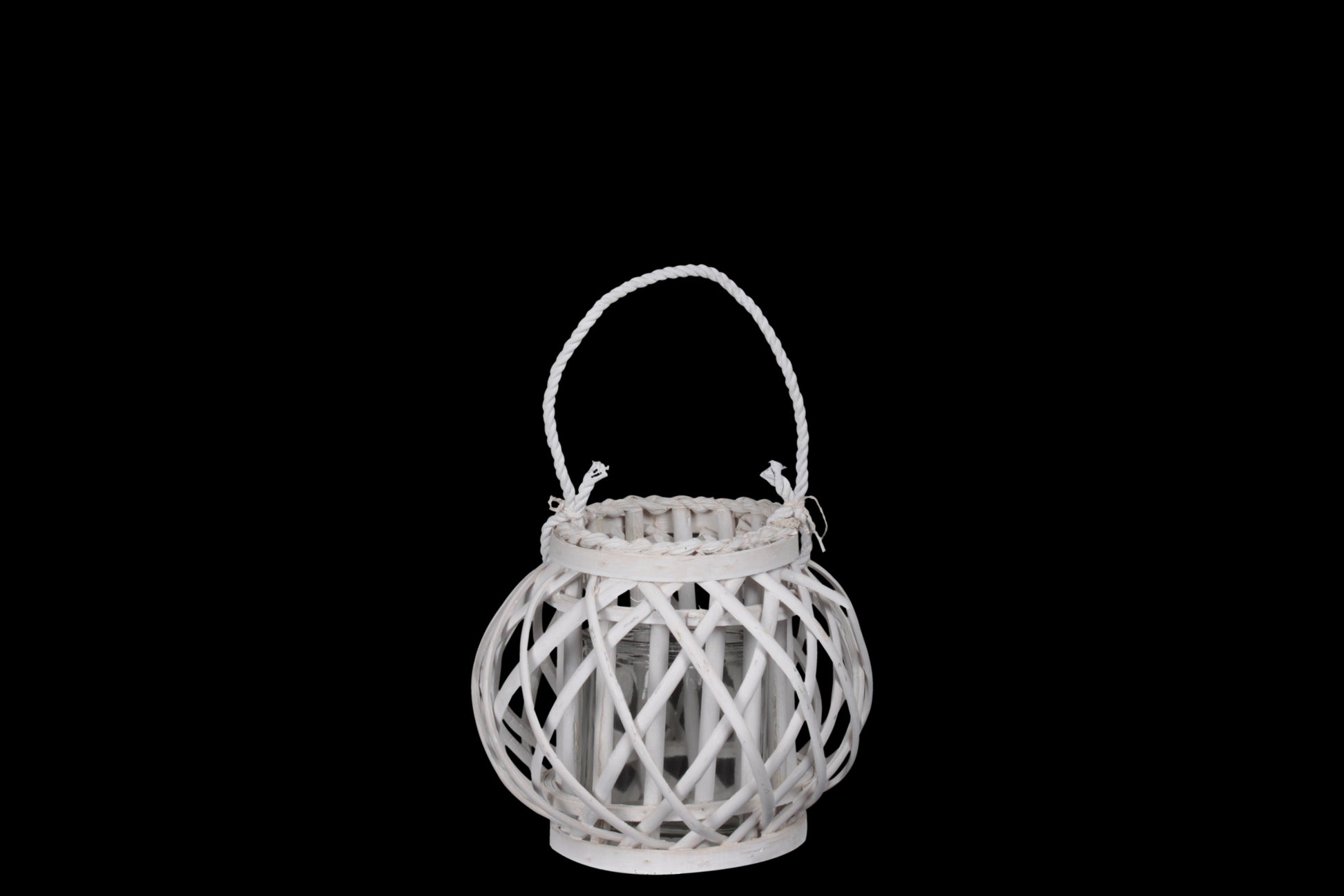 Bamboo Round Bellied Lantern with Rope Handle, Wooven Rim Mouth, Diagonal Lattice Design Body and Hurricane Glass Candle Holder SM Coated Finish White