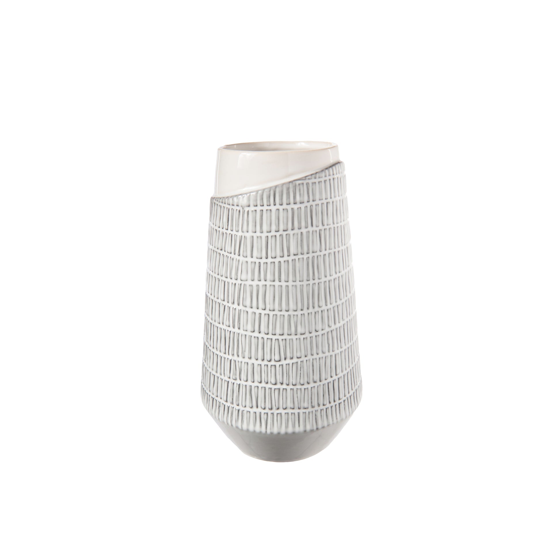 The Zavira Vertical Line Ceramic Vase blends modern simplicity with subtle texture through its embossed vertical cut-off line pattern. Crafted in glossy white ceramic with a tapered base, this vase is ideal for adding clean, sculptural charm to shelves, consoles, or tabletops. Available in small and large sizes for layered styling.