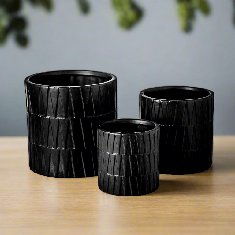 Elevate your home or office décor with this elegant ceramic pot set, featuring an embossed layered banded spike pattern that adds texture and sophistication. Each pot is crafted from high-quality ceramic with a smooth matte finish, perfect for showcasing your favorite indoor plants or succulents. The versatile round shape blends effortlessly with modern, rustic, or minimalist styles. Designed for durability and timeless appeal, this three-piece set offers multiple sizes to suit different arrangements. Ideal for use on shelves, countertops, or as a centerpiece accent.