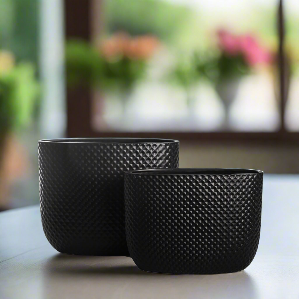 The Deyara Embossed Diamond Oval Planter Set (Set of 2) blends modern elegance with artisanal detailing. Designed with a tall oval silhouette and wide opening, each planter features a beautifully embossed symmetric diamond pattern that adds subtle texture and dimension to your plant styling.