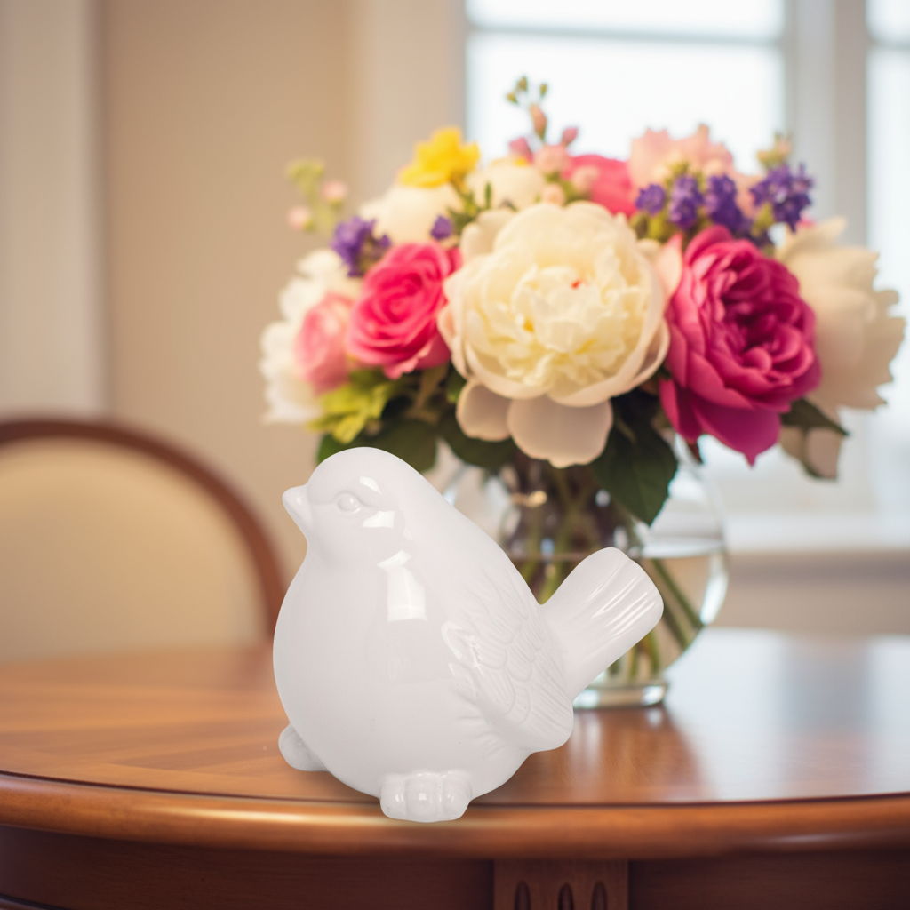 - Ceramic bird figurine with a refined, glossy finish