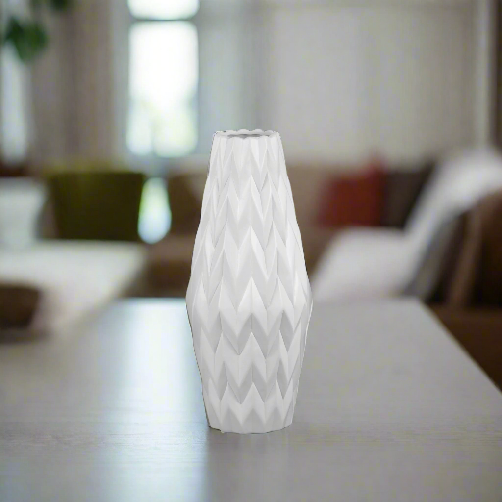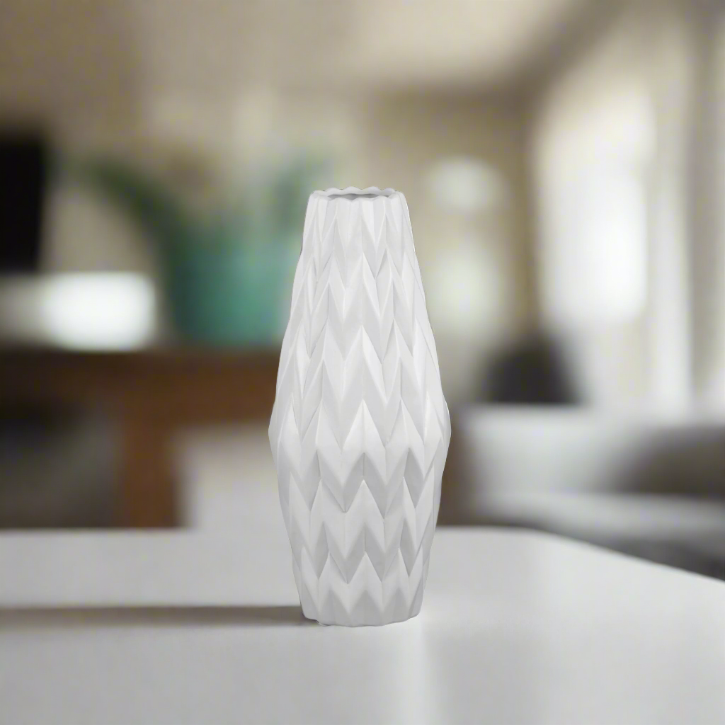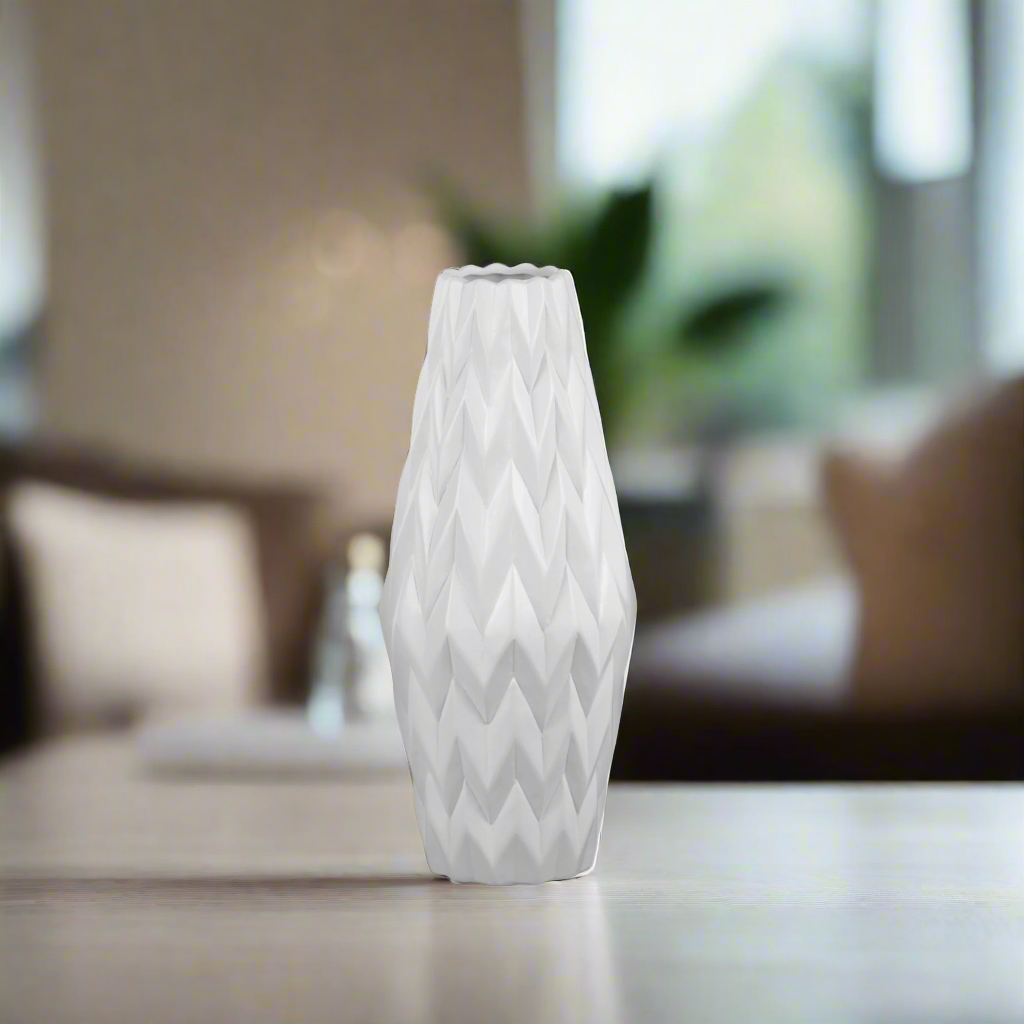 The Dallyn Vase is a graceful blend of sculptural form and refined detailing, designed to elevate any interior with timeless elegance. Its rounded bellied silhouette and embossed wave pattern create a subtle sense of movement, while the matte white finish provides a clean and versatile backdrop for both modern and transitional spaces. Whether styled with fresh florals, dried stems, or left as a standalone piece, this vase brings depth and sophistication to mantels, tabletops, or shelving displays.