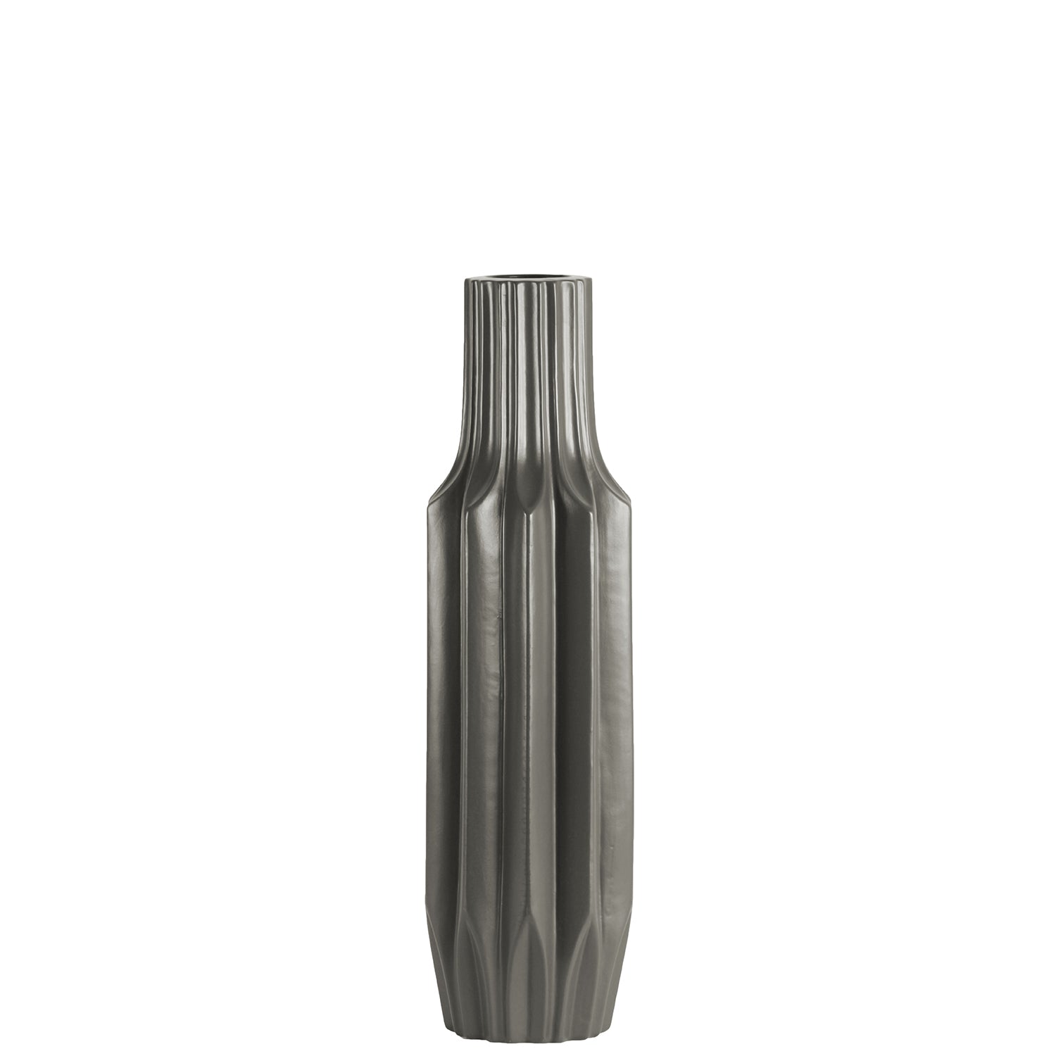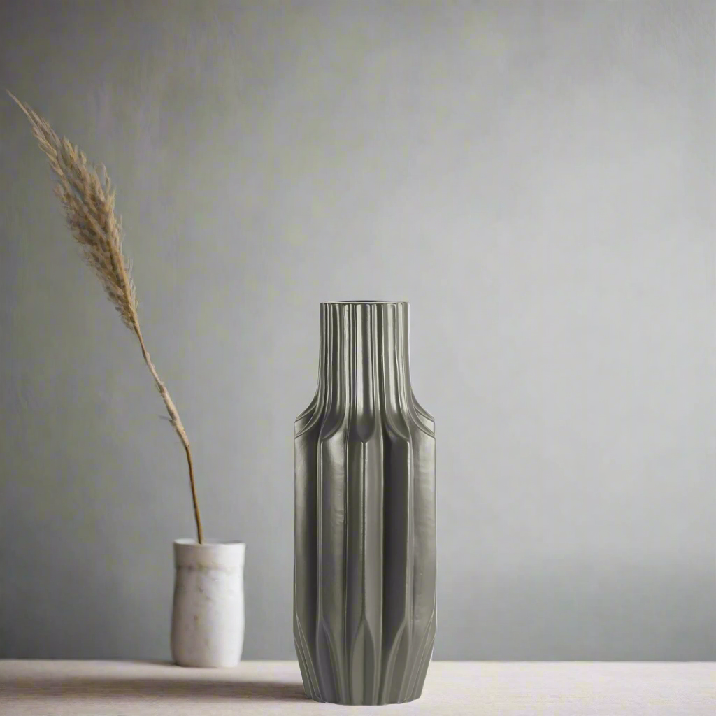 The Maeve Ceramic Patterned Wave Vase features a graceful round body with a short neck, beautifully detailed with an embossed wave design that flows into a tapered bottom. Finished in a matte dark taupe, this vase offers timeless sophistication and versatile charm. Available in two sizes, it makes a stunning standalone statement or can be styled as a coordinated set.