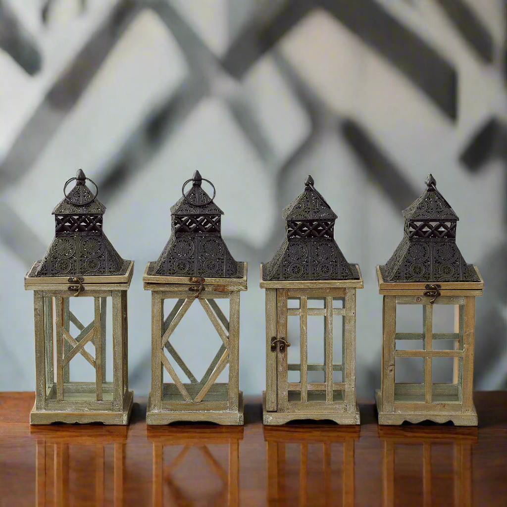 The Taren Square Wood Lanterns blend rustic charm with industrial accents. Each lantern features a natural wood frame, glass window panels, and a pierced black metal top with a ring hanger for added versatility. With four assorted designs in one cohesive set, Taren is perfect for tabletop displays, entryway styling, or seasonal decor setups.