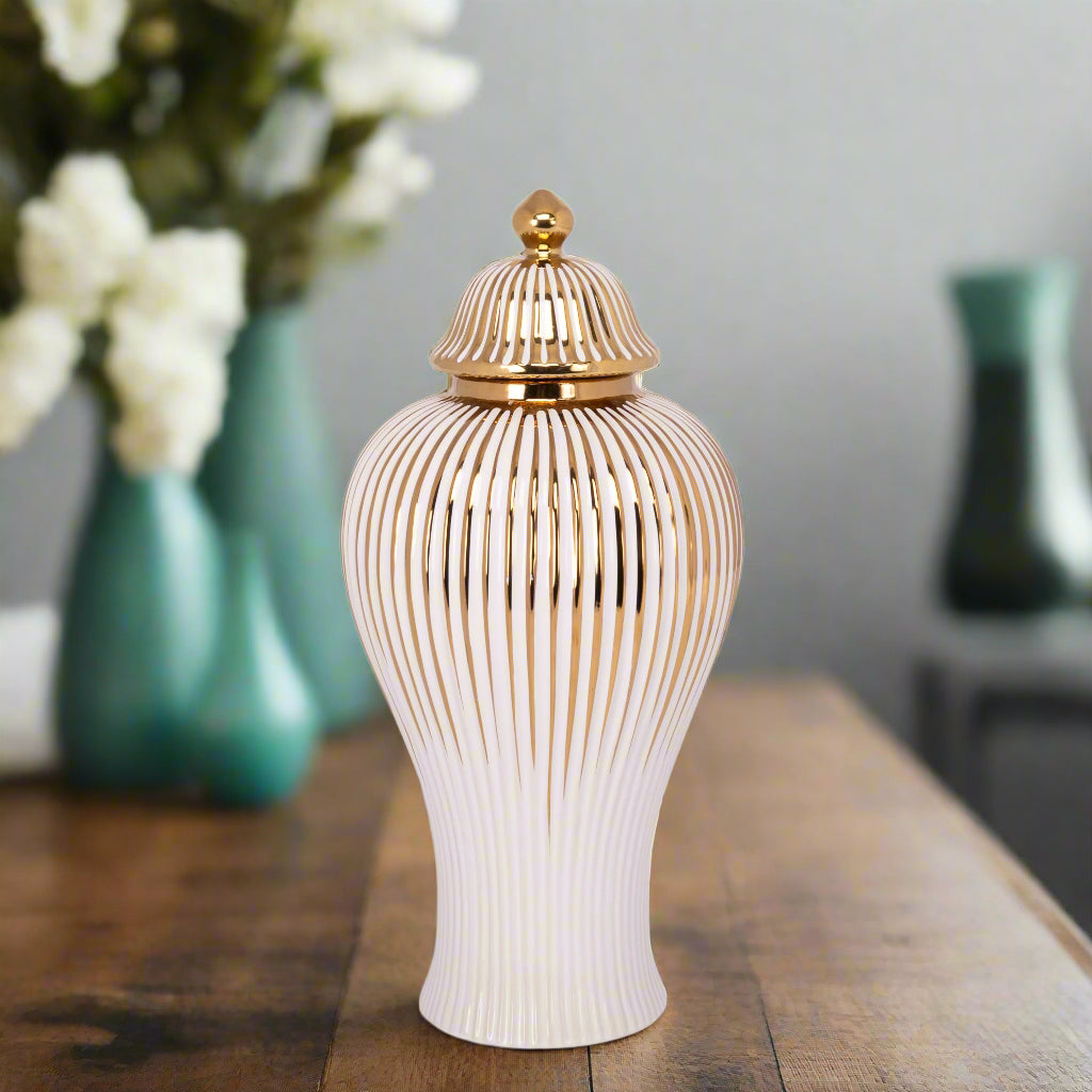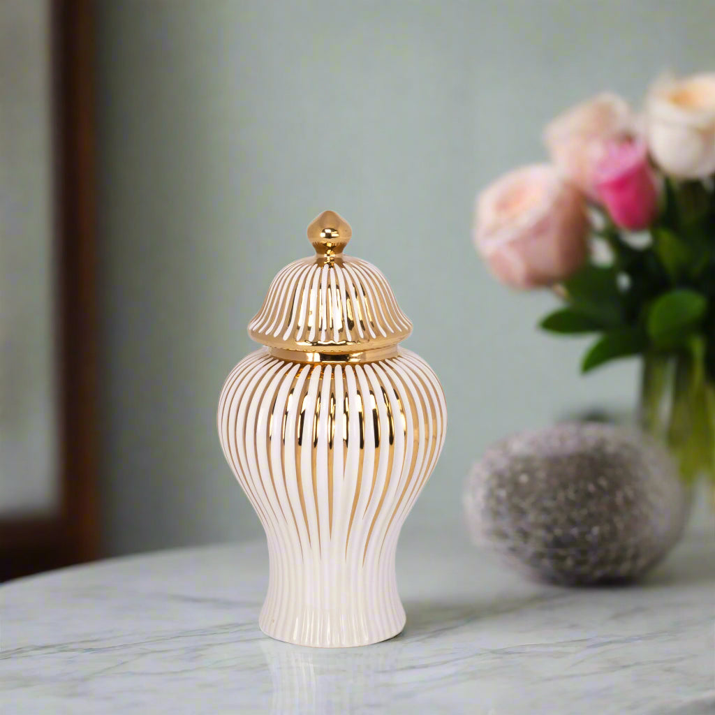 The Aurelian Ceramic Bellied Temple Jar with Lid blends classic form with refined detail. Its ribbed body and lid are accented with soft gold striping, adding texture and a subtle shine against the smooth ceramic surface. A timeless decorative piece for consoles, shelves, or sideboards.
