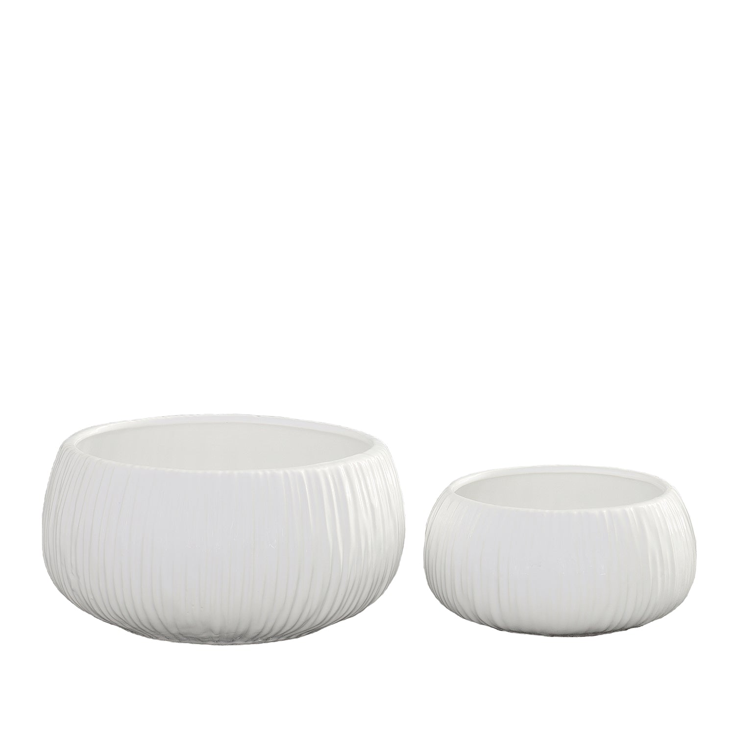 Elevate your indoor greenery with the timeless charm of the Soliva Ceramic Ribbed Flower Pot Set. Designed with a modern round silhouette and ribbed detailing, these pots effortlessly complement any space—from minimalist to coastal or transitional. The coated white finish brings a clean, polished look while enhancing the texture and depth of the ribbed sides. Perfect for displaying your favorite blooms or foliage, this duo is both functional and decorative. Whether styled on a tabletop, shelf, or windowsill, the Soliva set brings a fresh, sculptural accent to your plant display.