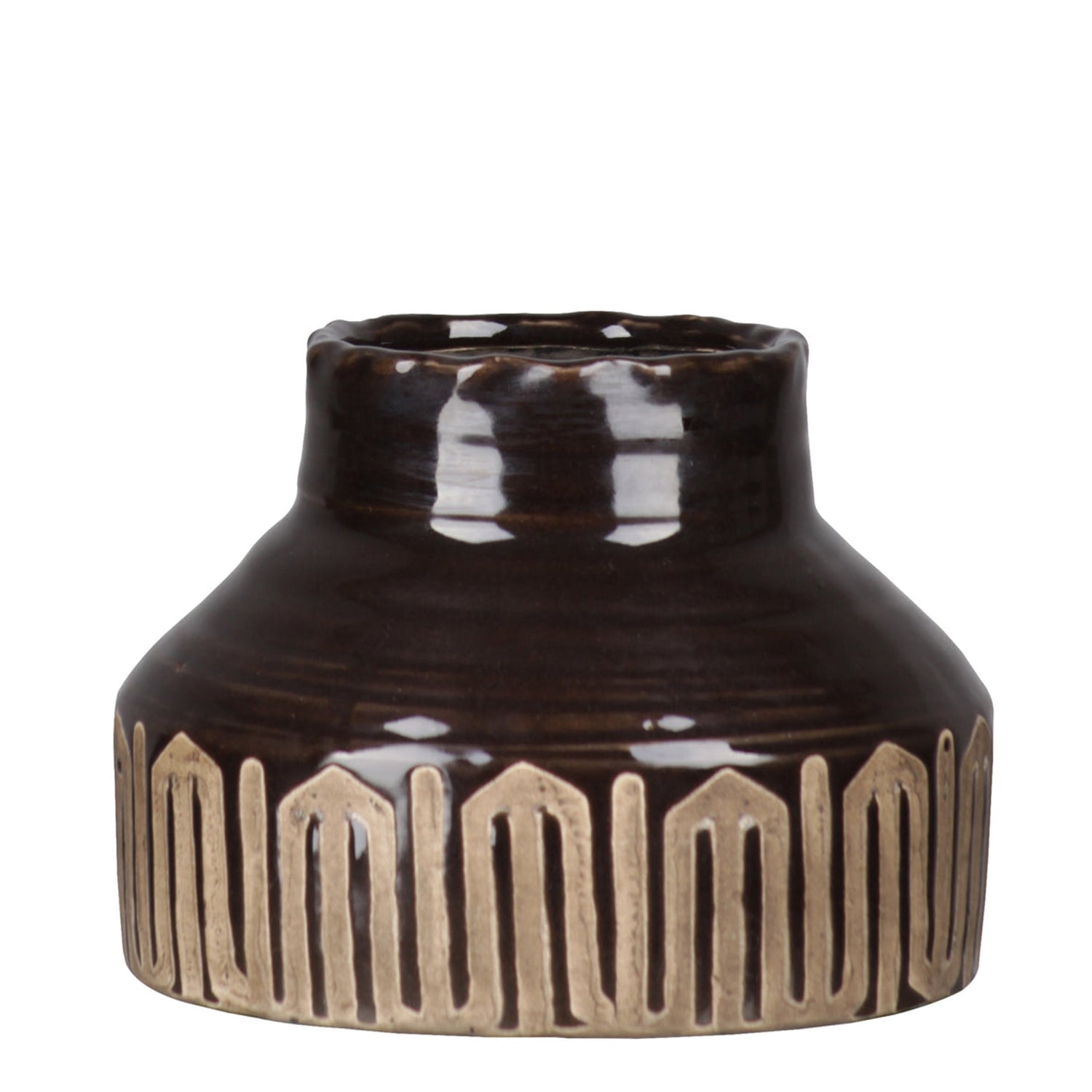 A blend of tribal-inspired charm and modern form, the Ciro Ceramic Vase features a glossy dark brown finish with an irregular narrow lip and a banded tribal pattern design at the base. Available in two distinct shapes—perfect for mixing, matching, or styling on its own.