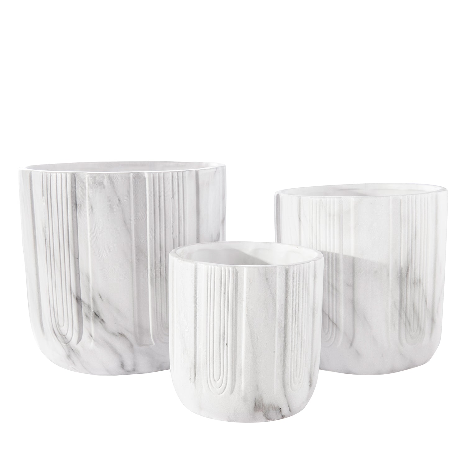 Looking for planters that combine refined texture with modern elegance? The Davina Ceramic Round Planter Set features a debossed column pattern in a seamless overlay design, paired with a marble finish for timeless appeal. Perfect for greenery, succulents, or florals, these planters add a sophisticated touch to any home, office, patio, or event décor.