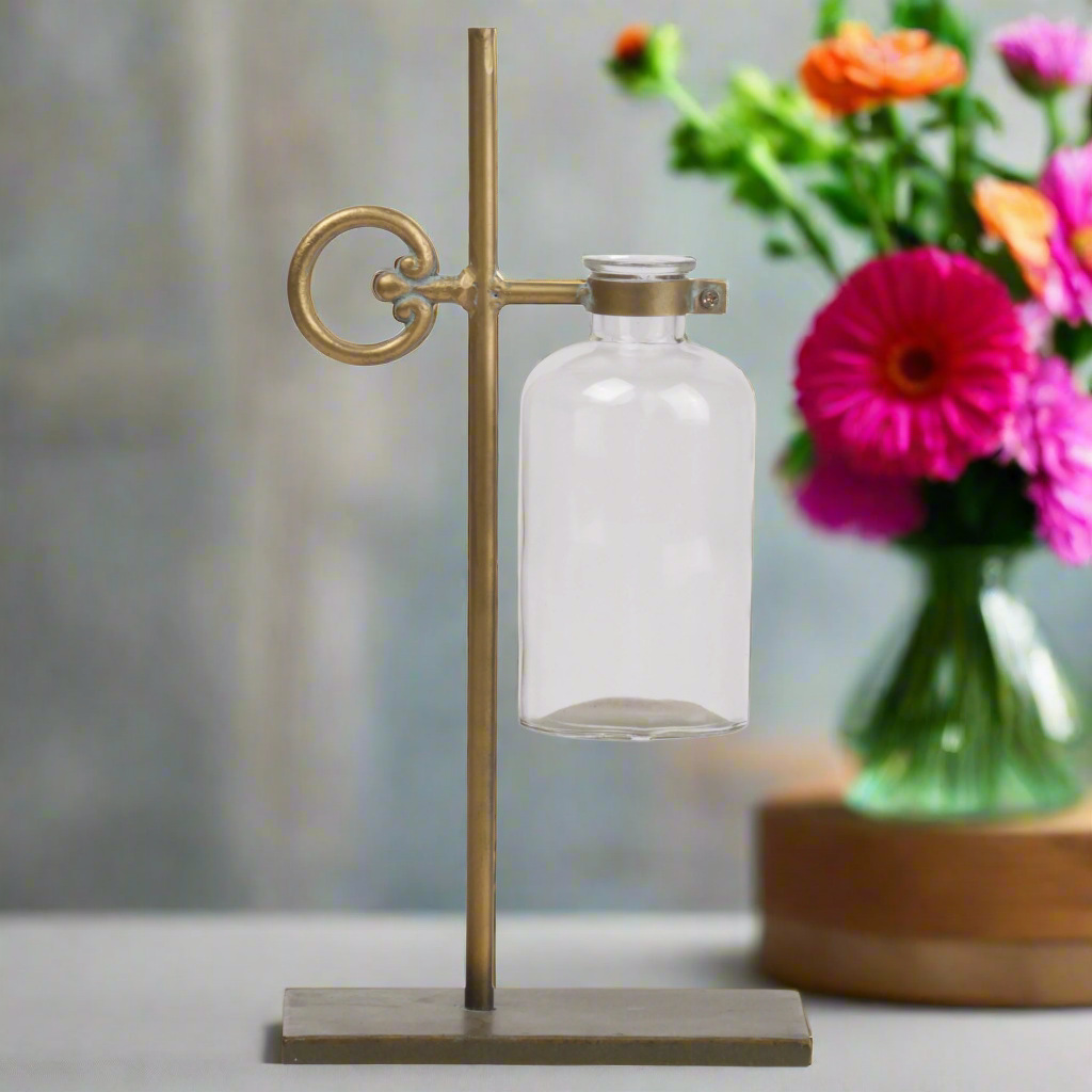Elevate your floral displays with the Edna Metal Bud Vase Holder. Designed with a suspended glass bottle vase resting on a sleek rectangular base, this piece features a side round handle for added style and functionality. The metallic gold finish brings a modern yet timeless charm, making it a perfect accent for any room or event décor.