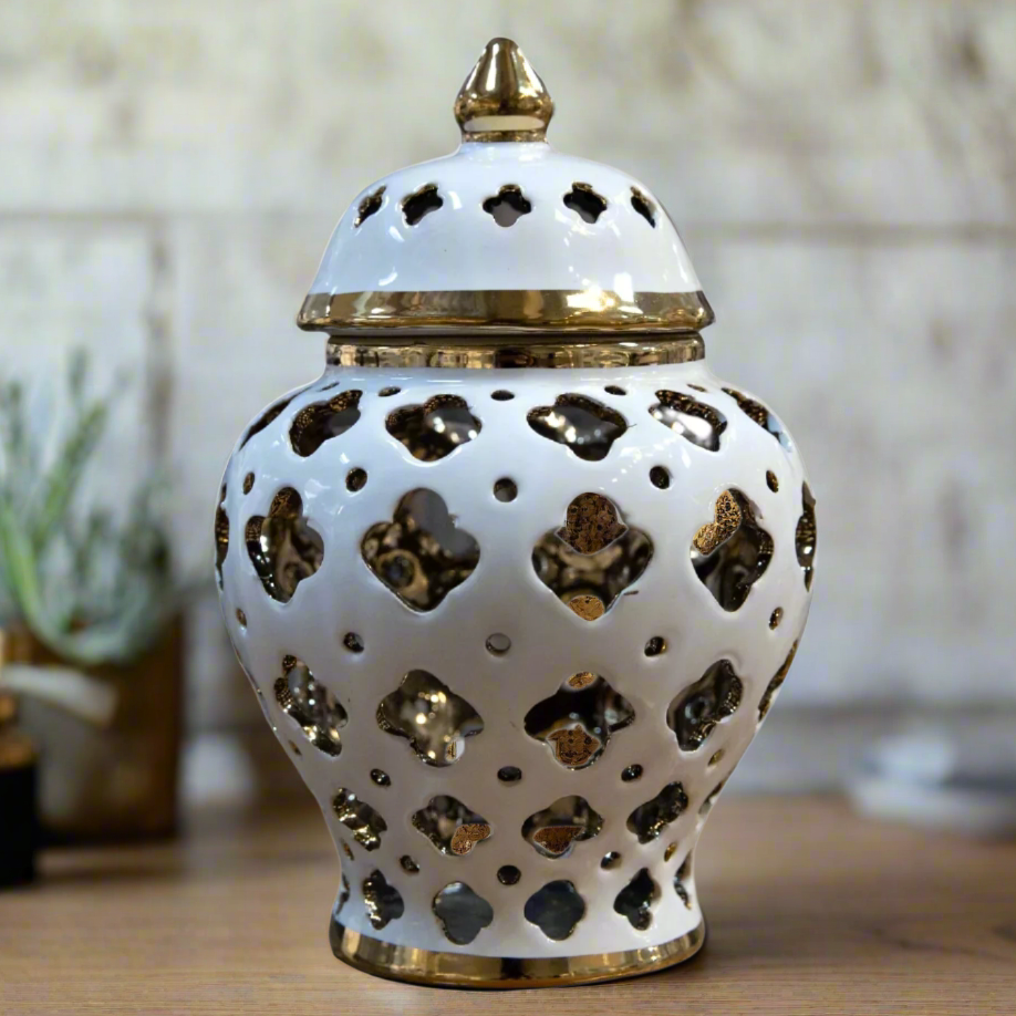 The Haven Porcelain Jar features a cutout quatrefoil design along the body and a smooth, tapered base. Finished in a glossy white and gold combination, it comes with a matching lid, making it a stylish accent for shelves, tables, or consoles. Decorative and versatile, it's suitable for display on its own or grouped with other pieces.