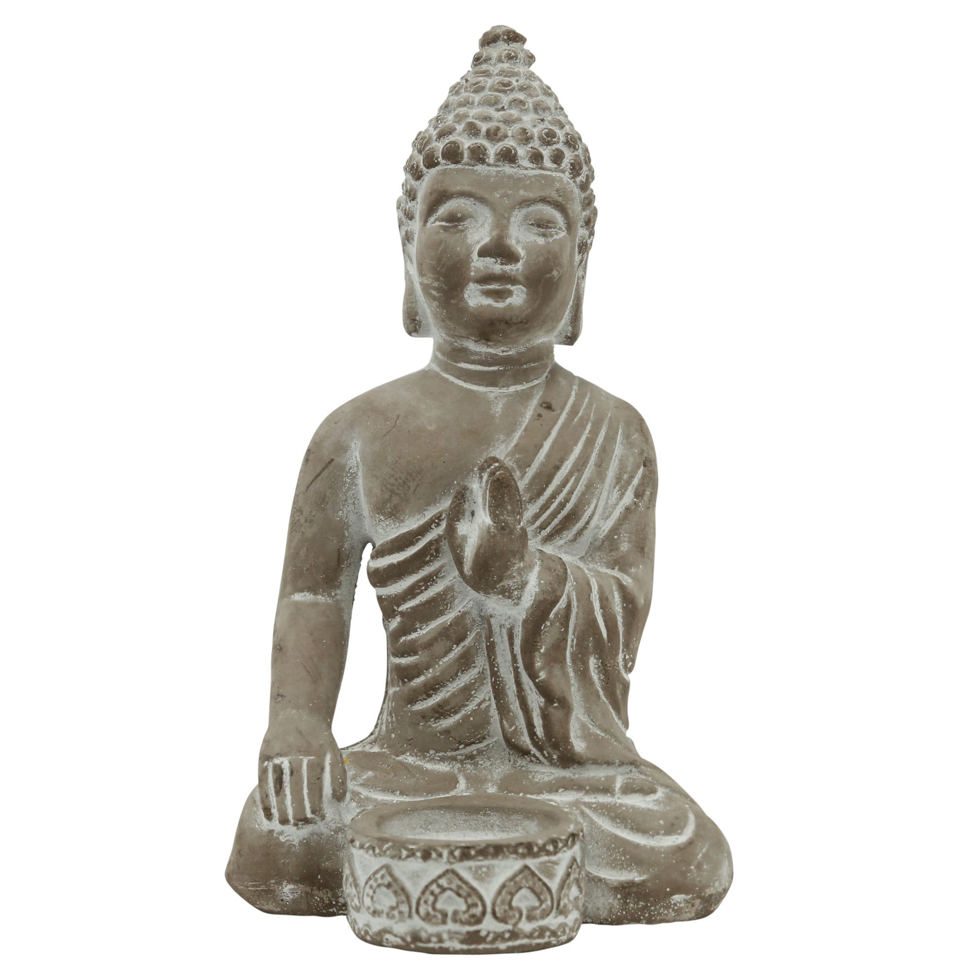 Seeking a serene accent for your home or meditation space? The Kileigh Cement Buddha Figurine captures tranquility in a meditative Abhaya Mudra pose, symbolizing peace and reassurance. Thoughtfully designed with a front candle holder, this piece creates a warm and calming glow that enhances both spiritual and decorative settings. The natural gray cement finish lends an earthy, grounded presence, making it a meaningful addition to any interior.