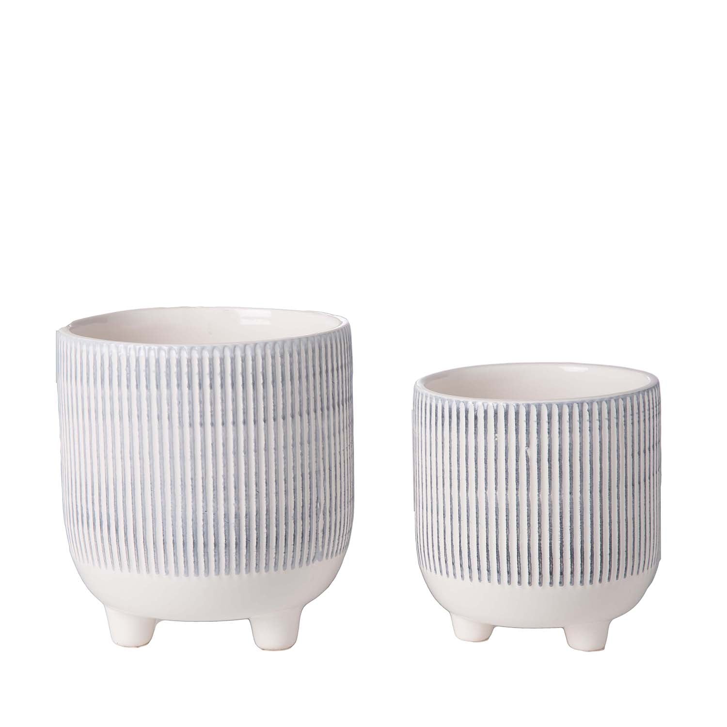 - Set of two ceramic round planters with tripod stands