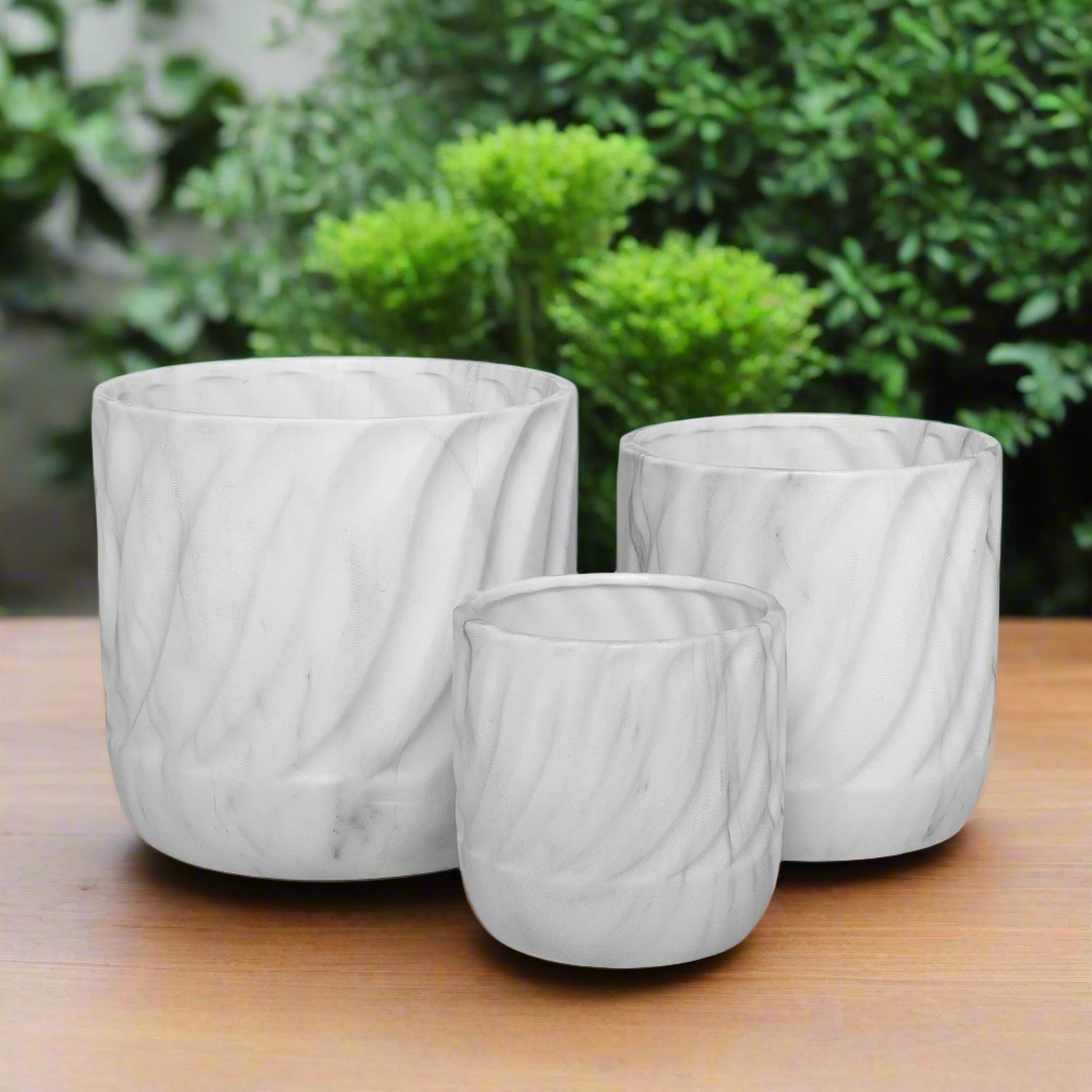 Looking for planters that pair graceful texture with timeless charm? The Loira Ceramic Round Planter Set features a debossed wave pattern in a seamless overlay design, enhanced with a refined marble finish. Perfect for displaying greenery, succulents, or floral arrangements, these planters bring elegance and versatility to homes, patios, offices, or event décor.