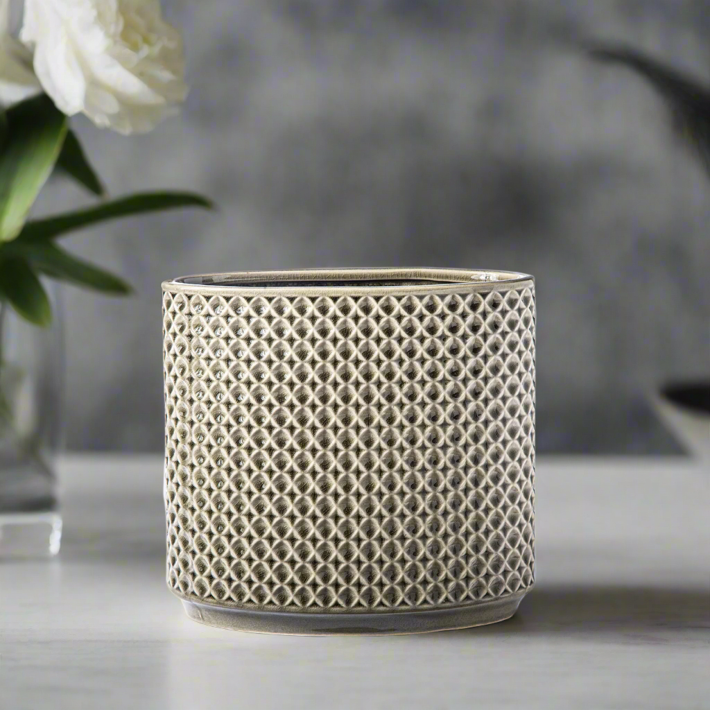 - Elegant oval-shaped ceramic pot with intricate pressed clover link pattern