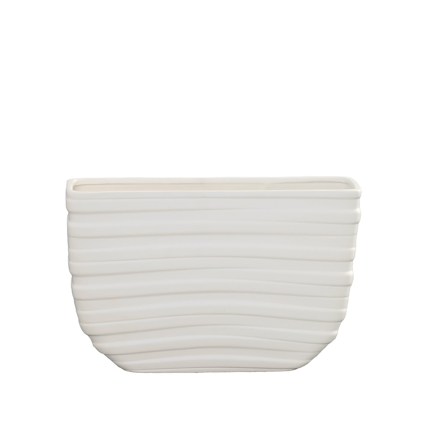 The Marcelline White Ceramic Banded Rectangle Pot blends minimalism with artisan charm. Its elongated rectangular body is defined by an embossed alternating banded pattern, creating subtle texture that contrasts beautifully with the smooth matte white finish. Designed with a low and wide profile, this pot is perfect for displaying plants, floral arrangements, or as a sophisticated decorative centerpiece.