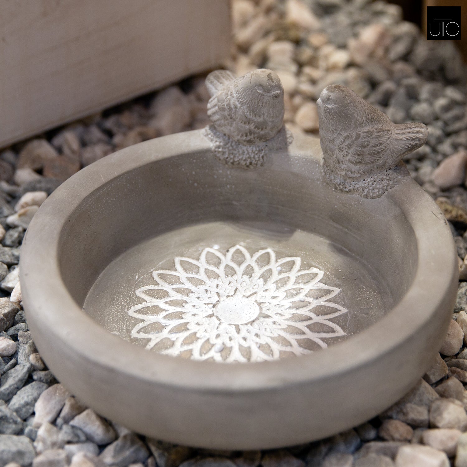 The Rizze Engraved Floral Bird Bath Figurine showcases a round cement design with a charming perched bird and detailed floral engravings. Its washed concrete finish adds a weathered charm, perfect for enhancing outdoor spaces.