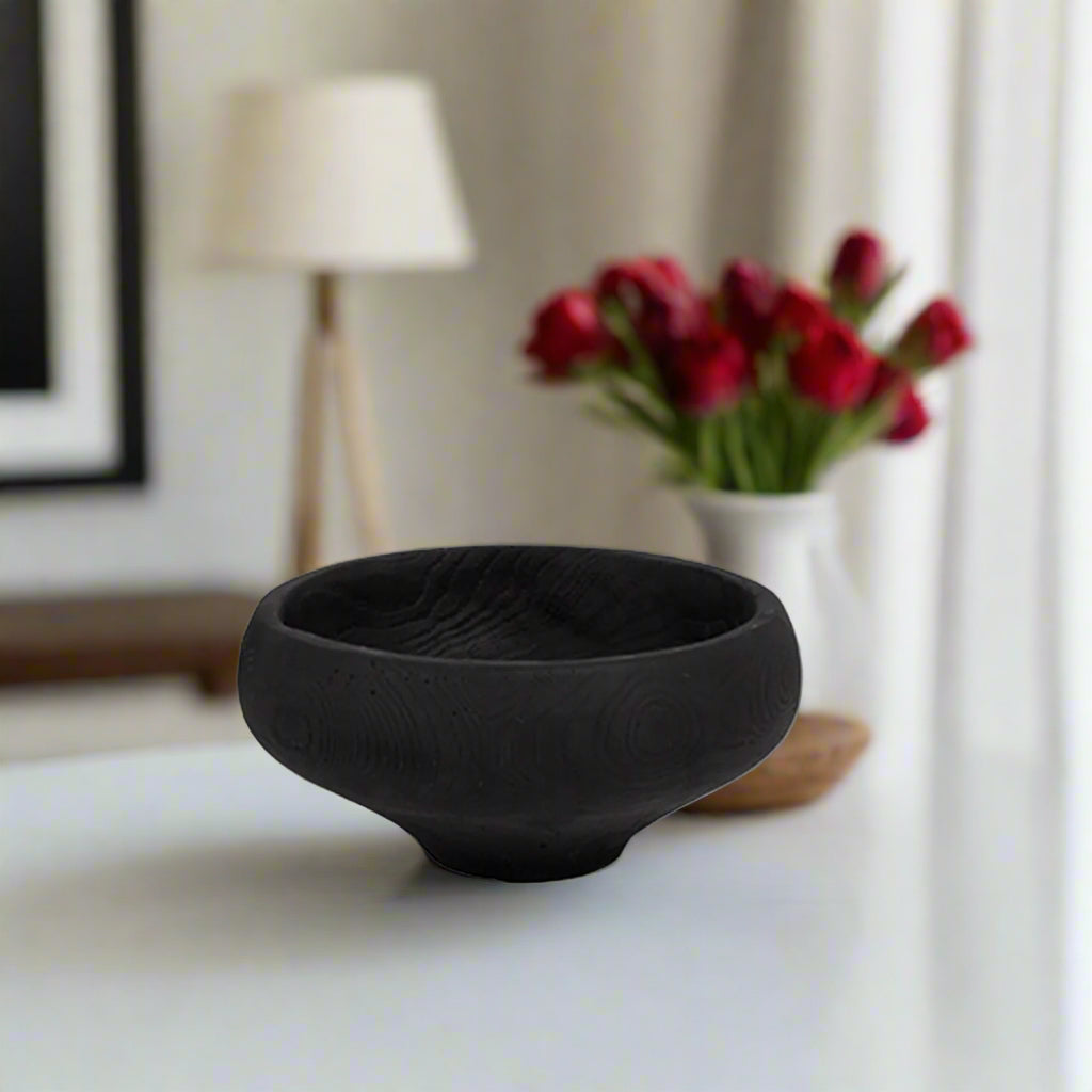 The Rowan Cement Decorative Bowl features a low, wide shape with a deep black finish and a slightly rough, natural texture. Its simple, sturdy design makes it a versatile piece, perfect for use as a centerpiece, planter base, or stand-alone accent in any room.