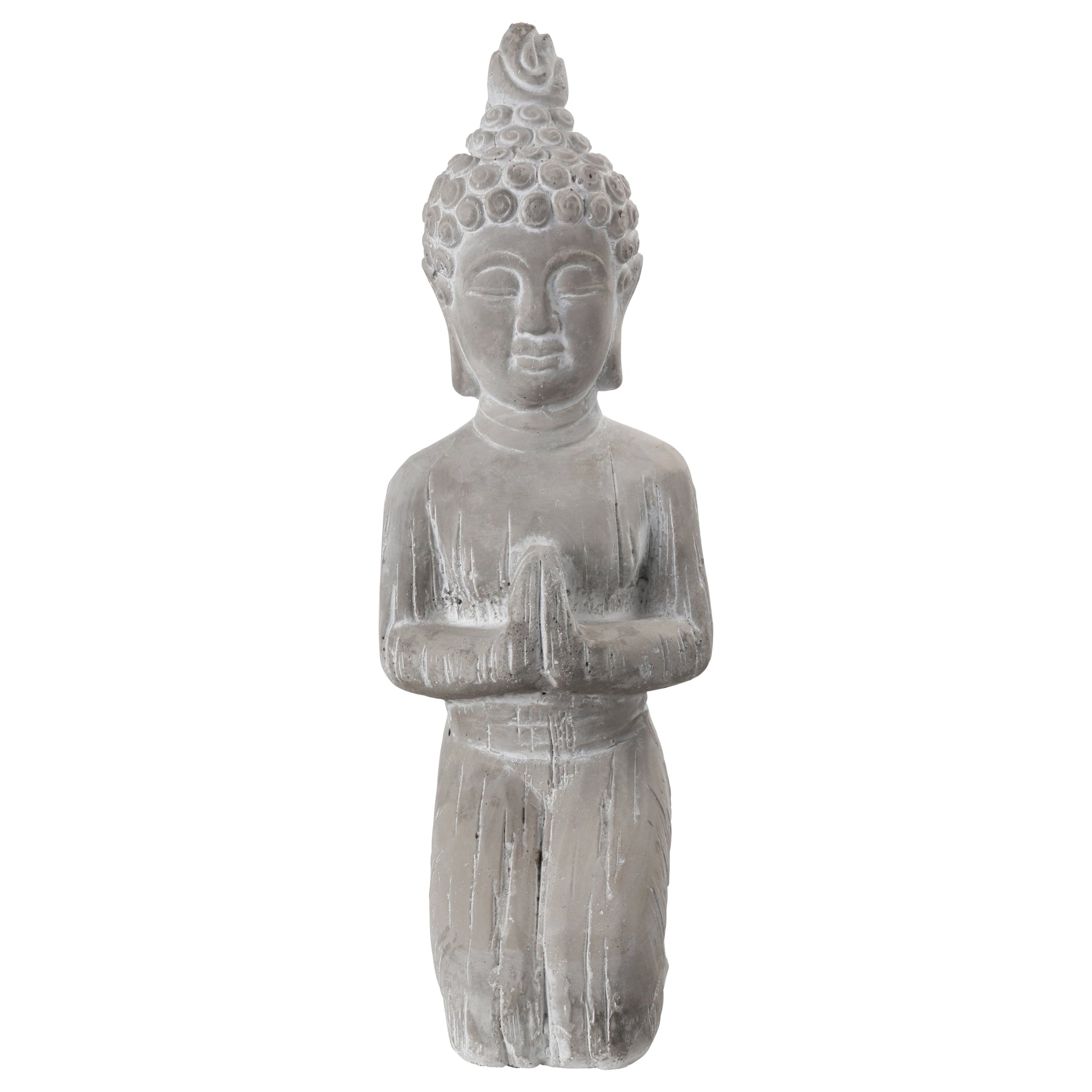 Bring serenity to your space with our Cement Kneeling Buddha Figurine, a perfect blend of spirituality and modern elegance. Featuring the Karana Mudra and Anjali Mudra hand positions, this beautifully detailed piece symbolizes the dispelling of negativity and invites peace into your surroundings. The washed gray finish and flat base with a front candle holder make it a versatile centerpiece for your home, garden, or meditation space.