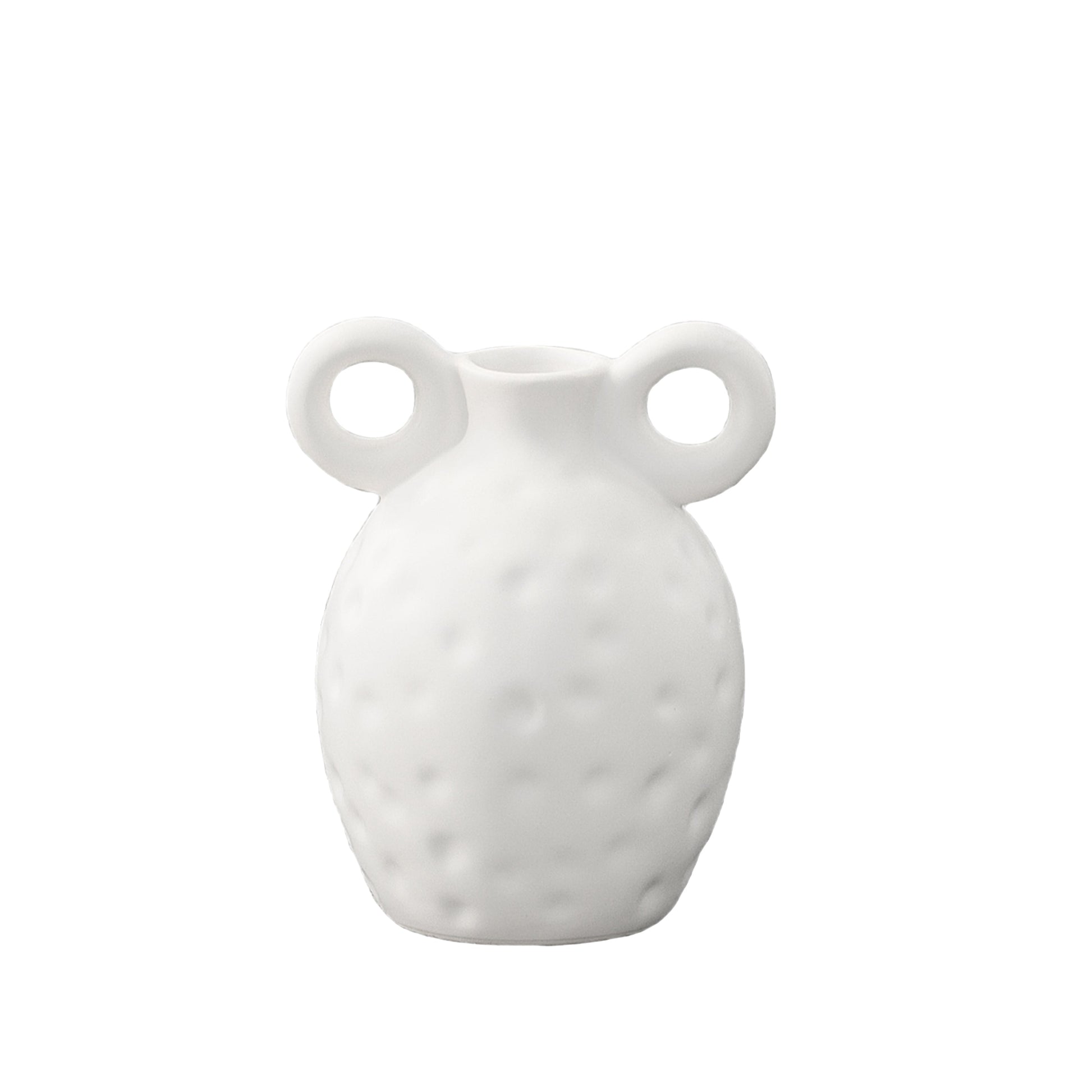 Looking for a small accent with character? The Vetra Ceramic Vase features a soft matte white finish, rounded pelike shape, and playful dimple details across the body. Side ring handles add a touch of sculptural charm, making it a standout piece for any shelf or tabletop.