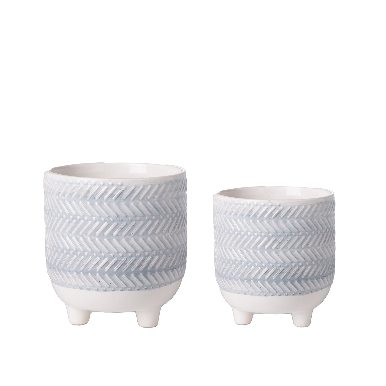 The Veyric Geometric Tripod Planter Set (Set of 2) offers a stylish blend of texture and elevation for your plant displays. Each ceramic round pot is adorned with an embossed geometric vector column pattern that adds depth and character. Resting on tripod stands, these planters bring height and visual balance to any arrangement, while their glossy finish provides a modern, polished look.